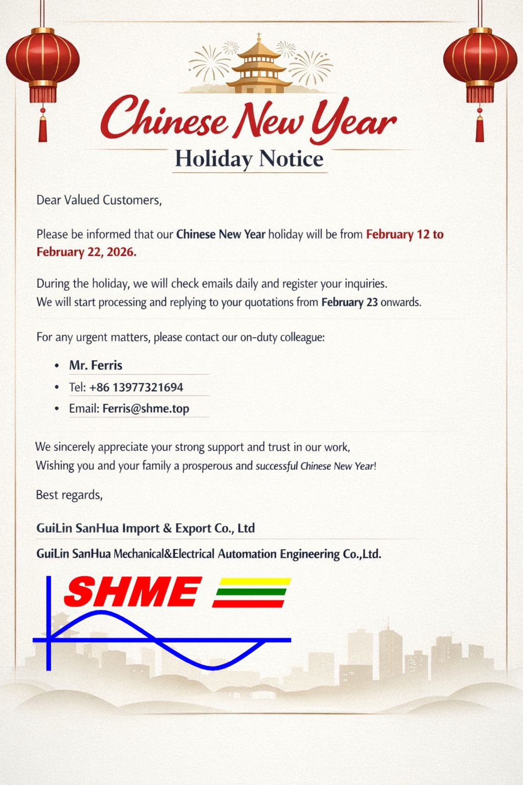 По любым неотложным вопросам во время праздника обращайтесь к нашему дежурному коллеге: г-ну Феррису. Тел.: +86 13977321694 Электронная почта: Ferris@shme.top